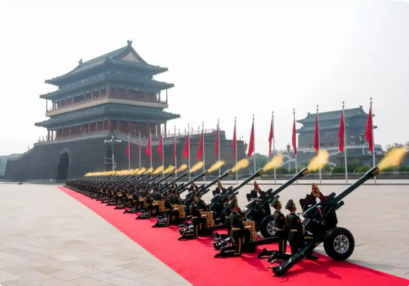 9月3日,在紀(jì)念中國(guó)人民抗日戰(zhàn)爭(zhēng)暨世界反法西斯戰(zhàn)爭(zhēng)勝利80周年大會(huì)上,56門禮炮鳴放80響,象征抗戰(zhàn)勝利80周年。